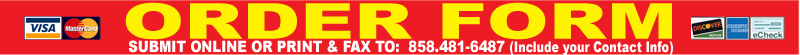IF YOU ARE FAXING YOUR ORDER IN, PLEASE COMPLETE THE FOLLOWING CONTACT INFO: (If you are ordering online, PayPal will collect your contact info so you do not need to fill this out) PLEASE COMPLETE AND FAX TO: 858.481-6487